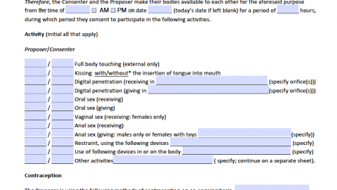 The sexual consent form is a clear written admission of consent between a “Consenter” and “Proposer” that relays in no uncertain terms the sexual acts the Consenter is comfortable with and willing to perform. It is a requirement that the Proposer and Consenter both be sexually attracted to each other. This document enables two consenting adults to relay in complete detail the acts they are … Continue reading Sexual Consent Form